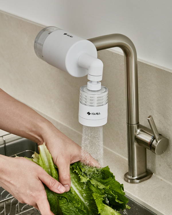 Synopex's self-developed 'Synopex Absolute Water Purifier' is a triple filtration product using △MDA (Melt-blown Depth Absolute) filter, △block activated carbon filter, and △PES membrane filter, and filters out 99.9% of fine contaminants, 100% of residual chlorine, and bacteria, and is characterized by its ability to be used with simple installation on sinks and various faucets.